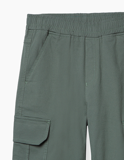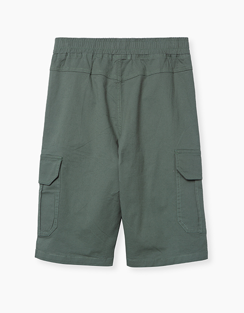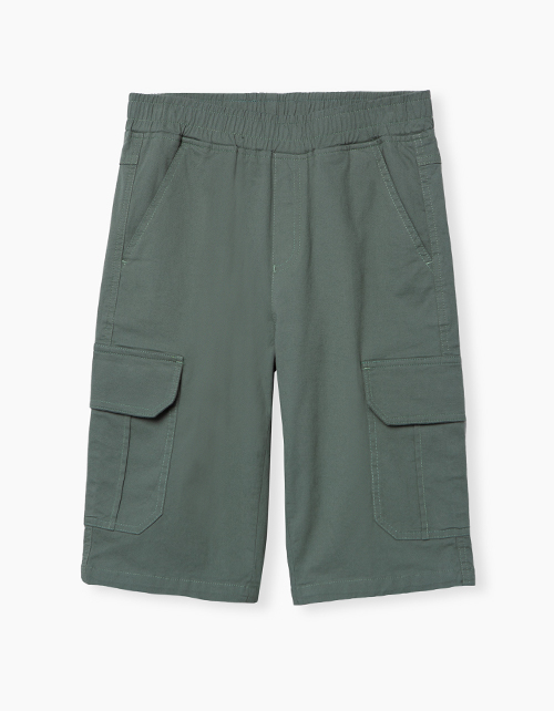 Шорты свободного силуэта в стиле карго для подростка. Из твила цвета хаки. Эластичный пояс обеспечивает комфортную посадку по талии. Вместительные карманы делают модель функциональной. Имитация гульфика и кокетка сзади добавляют стильные акценты