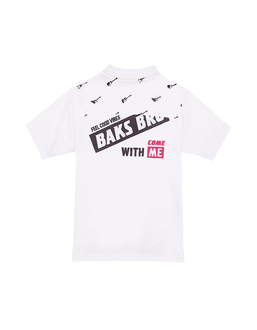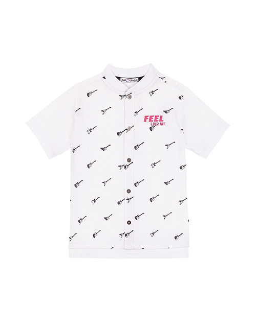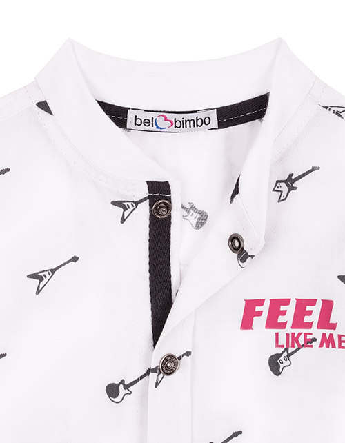 Верхняя сорочка для мальчика с коротким рукавом. Свободный силуэт. Застежка на книпперы, воротник-стойка. Манжеты рукавов и горловина из рибаны. Дизайнерское оформление в стилистике капсулы "Дружище Бакс".
