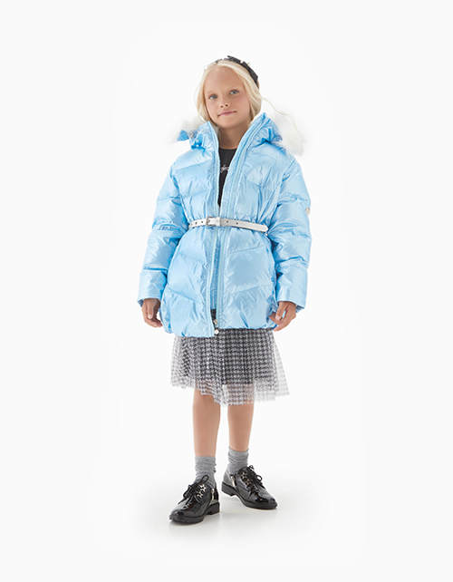 Куртка для девочки на пуху приталенного силуэта дополнена застежкой молнией, капюшоном с мехом и высоким воротником. Ткань плащевая дьюспо с жемчужным покрытием не пропускает влагу, а подкладка из флиса и нейлона гарантирует комфорт в носке.