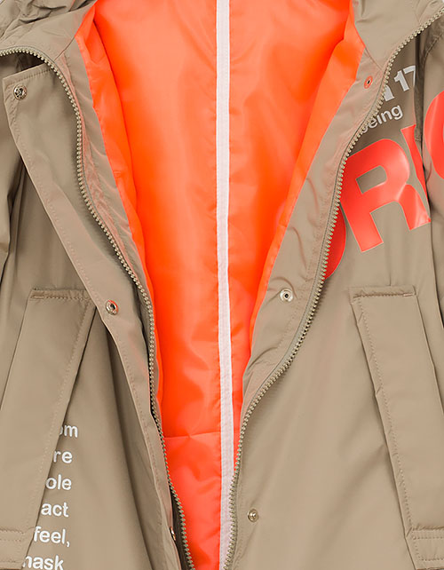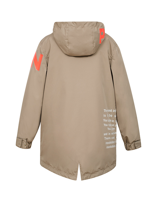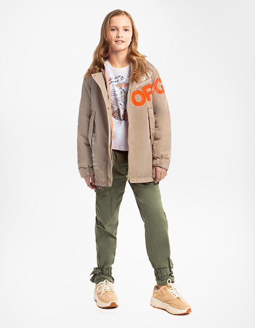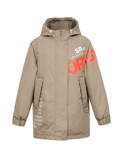 Бежевая куртка для девочки парочного типа. Объемный силуэт, разрез на спинке. Капюшон с регулировкой на резиновом шнурке-фиксаторе. Центральная застежка на молнии с планкой на потайных кнопках.