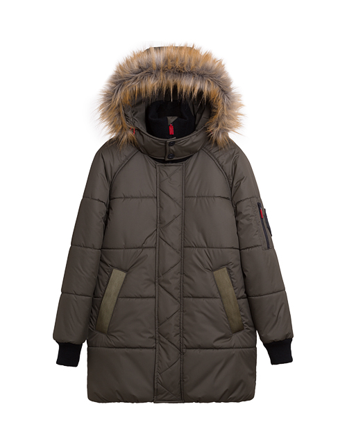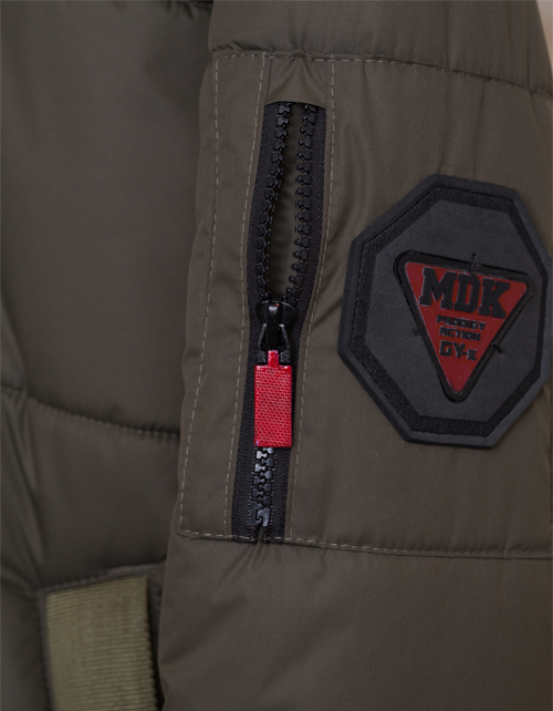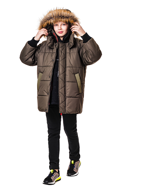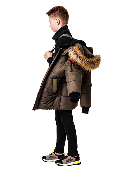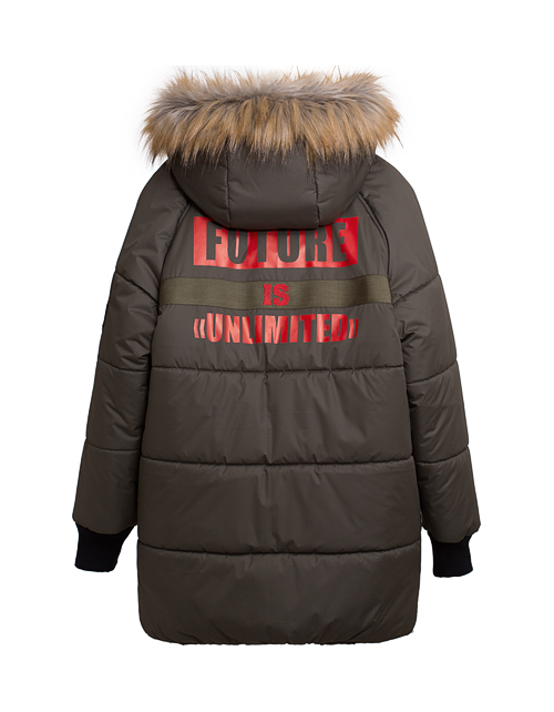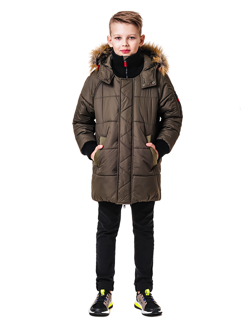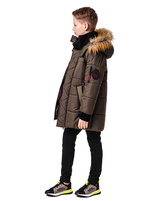 Теплая куртка для мальчика цвета хаки с мембранным покрытием. Съемная опушка, ветрозащитная планка. Застежка на молнии и кнопках. Нашивка-лейбл и принт