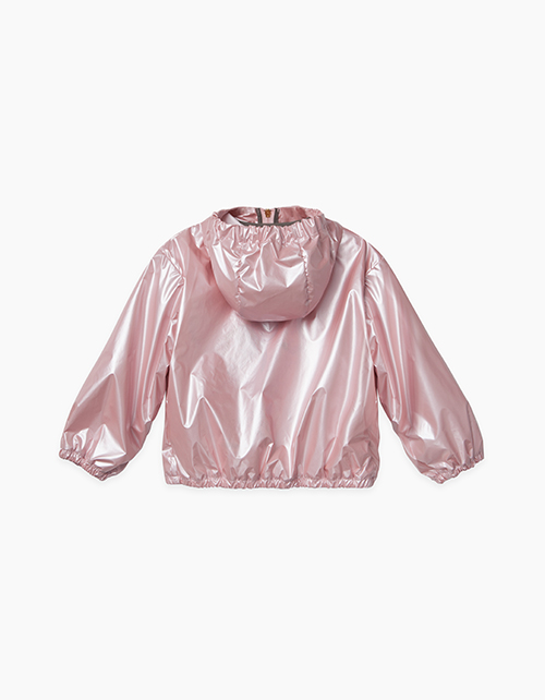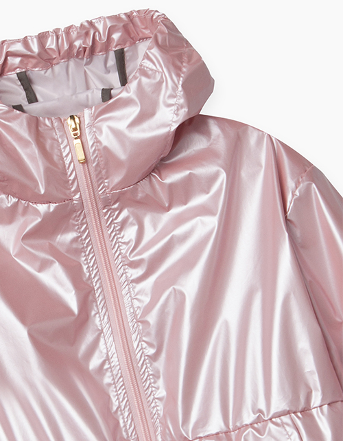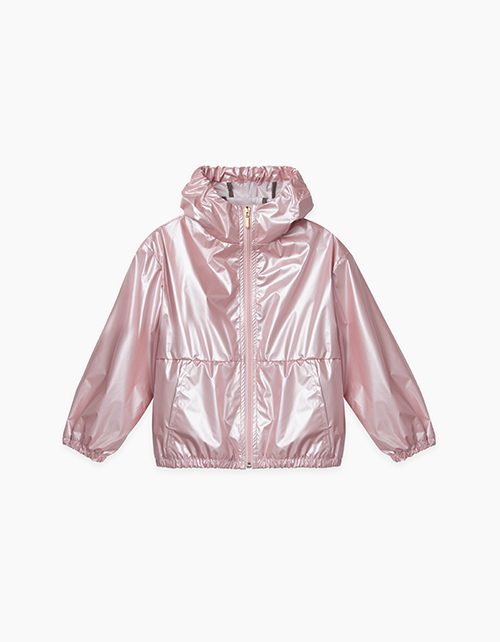 Стильная светло-розовая ветровка с капюшоном для девочки. Из плащевой ткани с перламутром, с застежкой-молнией и двумя боковыми карманами. Авторский акварельный принт в стиле капсулы "Райские птицы" на внутренней стороне