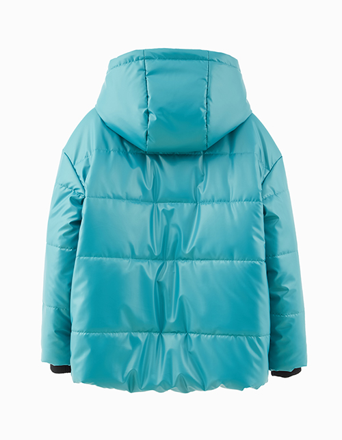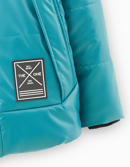 Темно-бирюзовая зимняя куртка для мальчика. Модель с накладными карманами декорирована нашивкой-лейблом. Куртка выполнена из функциональной и простой в уходе ультрасовременной ткани с гладкой поверхностью и глянцевым блеском.