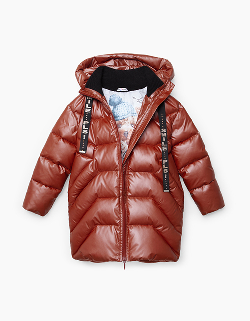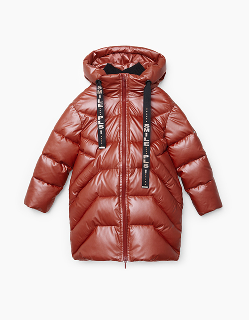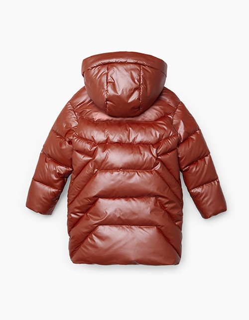 Терракотовая зимняя куртка из плащевой ткани с блеском. Модель из ветрозащитного и водоотталкивающего материала. Удобные карманы, притачной капюшон. Утеплена синтепухом и подходит для морозной зимы до -20 градусов.