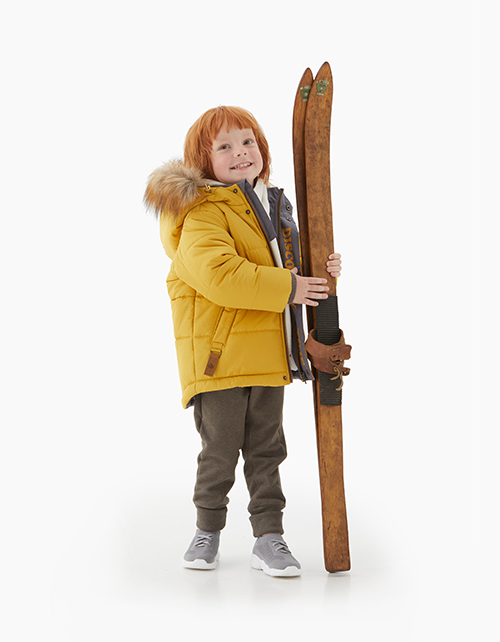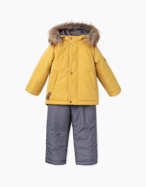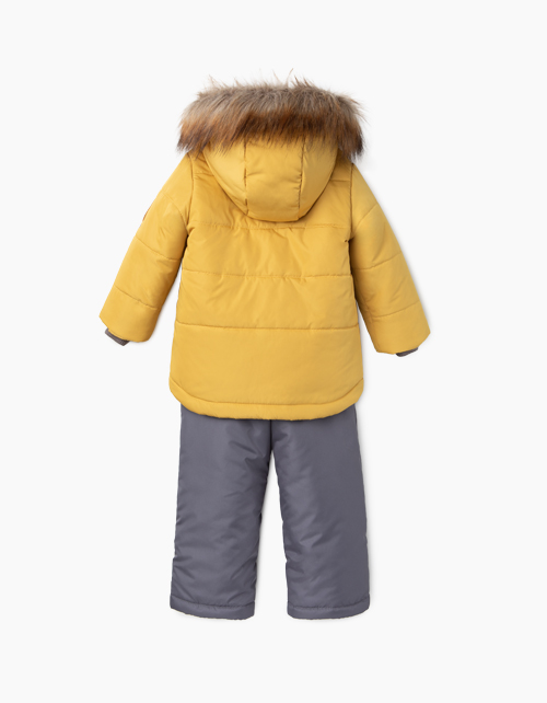 Зимний комплект для мальчика. Куртка и полукомбинезон на синтепоне. Водоотталкивающая ткань. Воротник и манжеты из трикотажа. Капюшон с отстежной опушкой. Аппликация в виде мамонта на рукаве, принт на клапане застежки