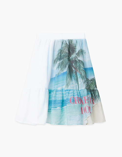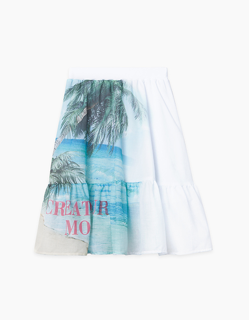 Легкая юбка для девочки-подростка, присборенная по линии талии, с притачным воланом. Выполнена из белого муслина с набивным принтом в виде морского пейзажа и надписью Create your mood ("Создай свое настроение"). На удобном эластичном поясе из рибаны