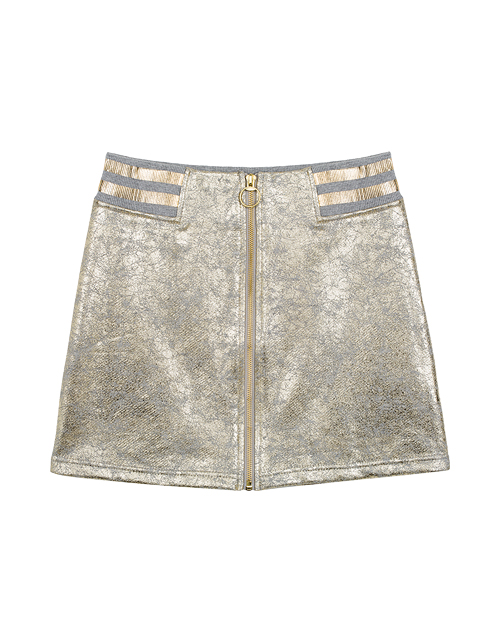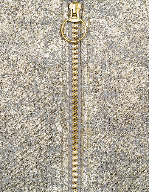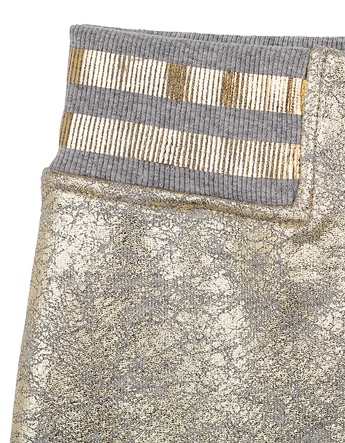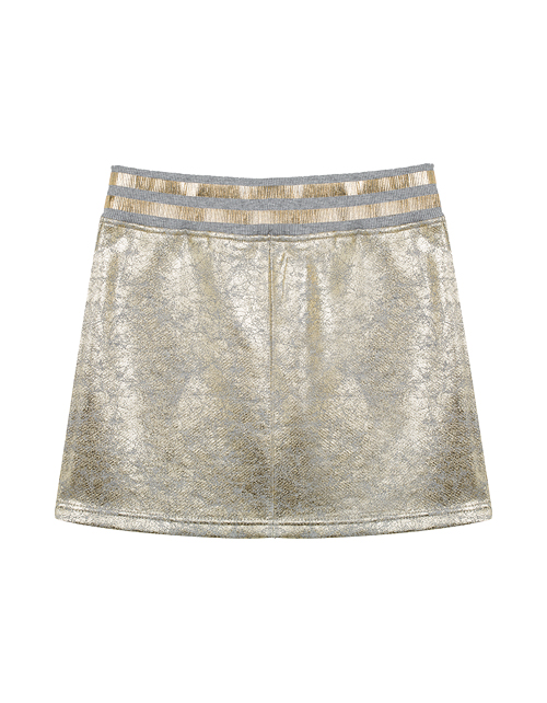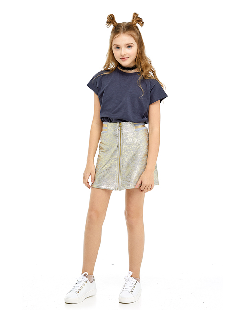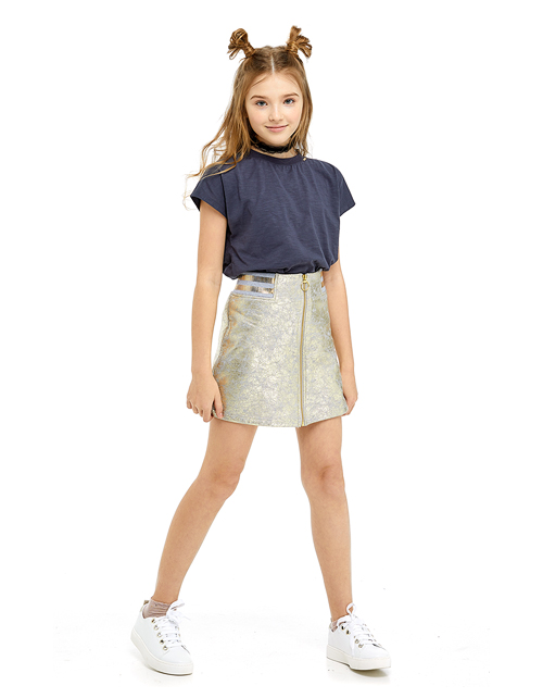 Стильная девочка непременно оценит оригинальный дизайн юбки-трапеции. Трендовая расцветка с эффектом металлик и комфортный эластичный пояс, декорированный золотистыми полосками в спортивном стиле, создают актуальный и непринуждённый образ