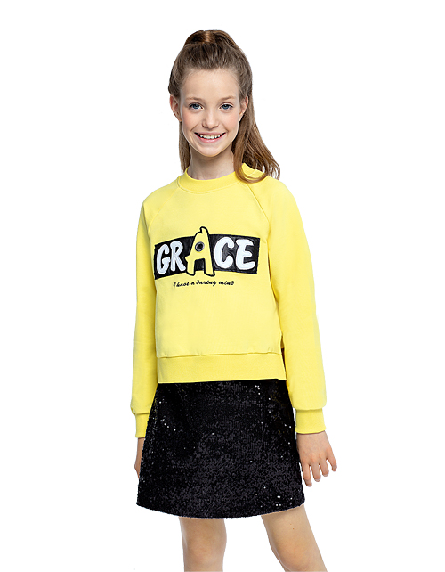 Юбка для девочки со сборками на талии дополнена удобным поясом на резинке, застежкой молнией на задней части изделия и отделкой из ткани с пайетками на передней. Ткань футер гарантирует износостойкость, а подкладка из вискозы обеспечивает комфорт в носке.