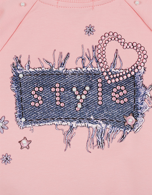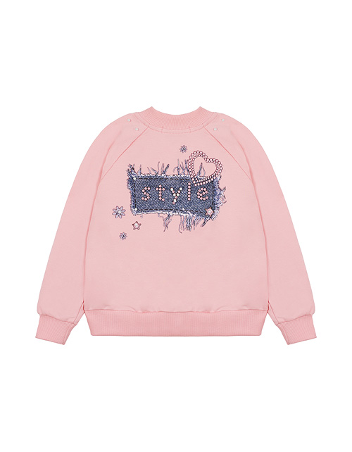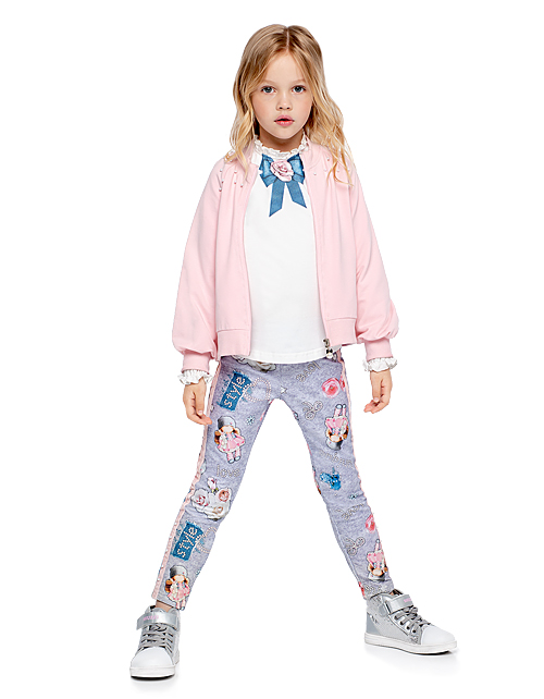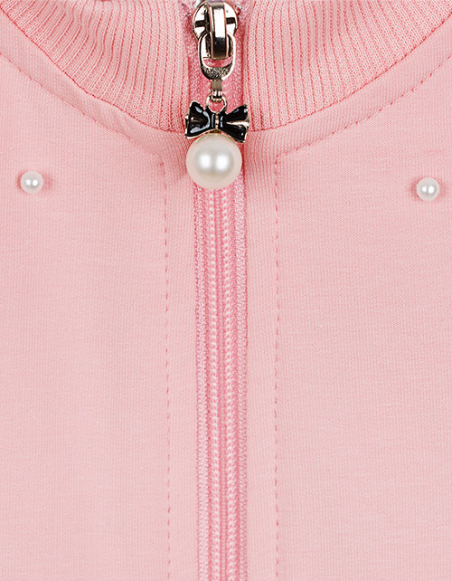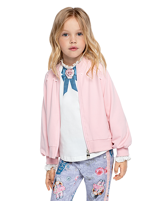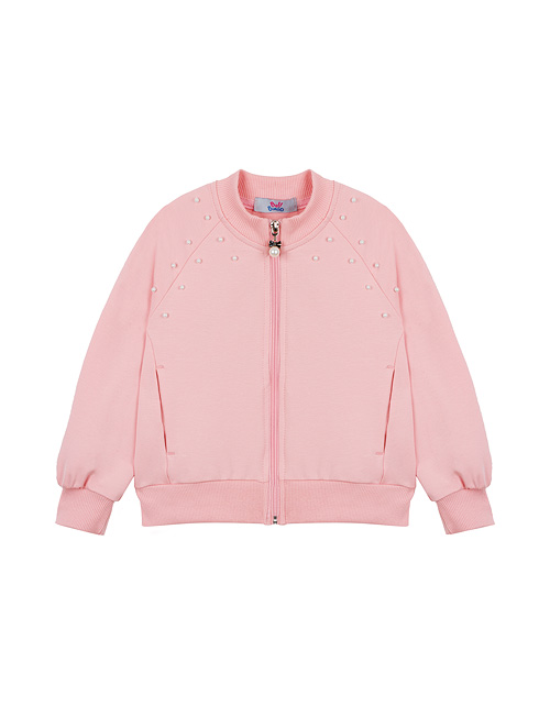 Светло-розовый жакет для девочки дополнен застежкой на молнию, двумя врезными карманами и манжетами на рукавах. Изделие имеет высокий воротник и декорировано бусинами спереди и стильным принтом сзади. Ткань футер дарит комфорт в носке.