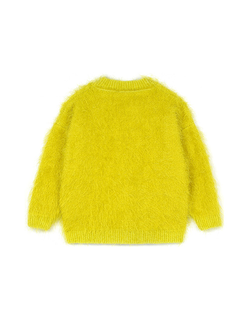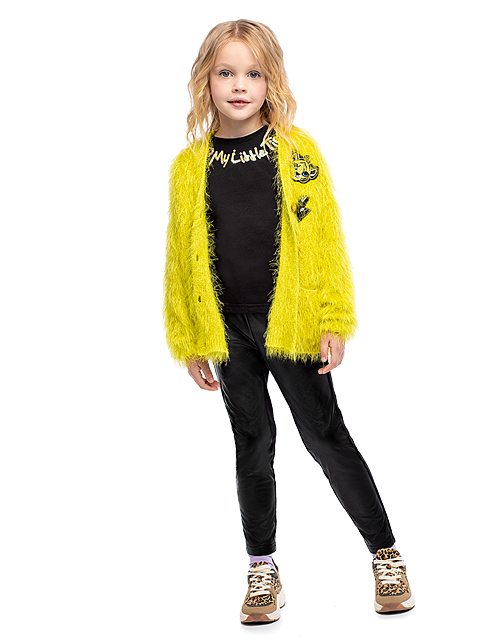 Жакет для девочки из пряжи с длинным ворсом свободного силуэта имеет застежку на пуговицах, два накладных кармана и нашивки в виде тигренка и молнии. Приятная к телу пряжа и свободный стиль изделия гарантируют комфорт в носке.