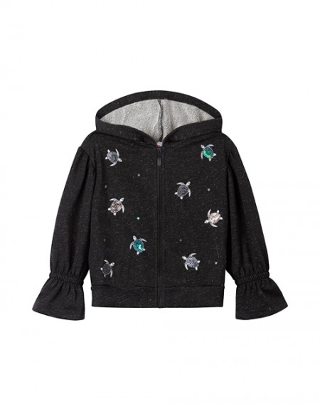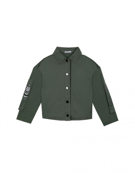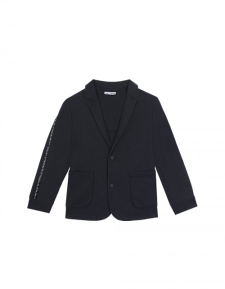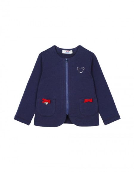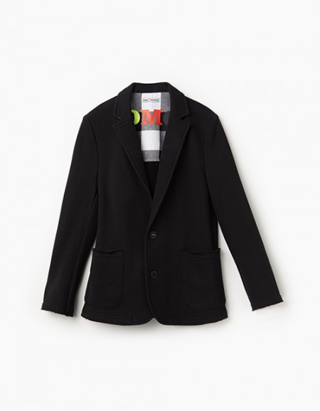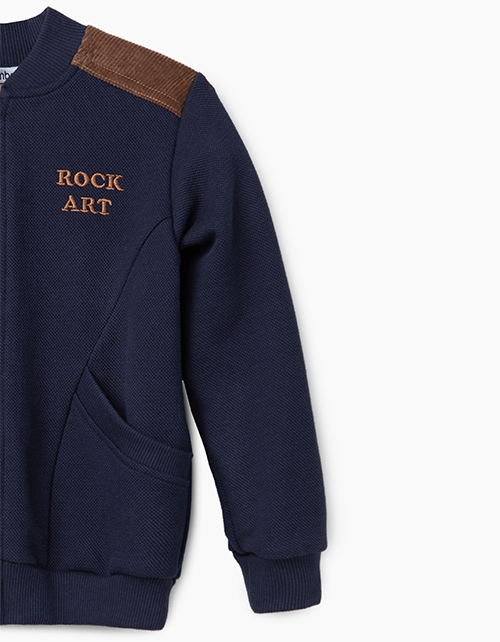 Жакет из темно-синего футера пике с начесом. Спинка с контрастной кокеткой из вельвета. Вышивка на груди и кармане в тон кокетке. Прямой силуэт. Застежка-молния. Манжеты, горловина и отделка карманов из рибаны