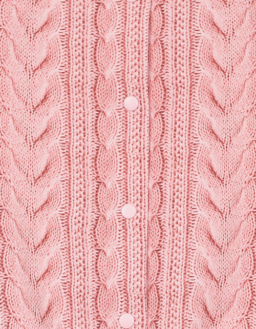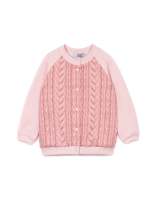 Розовый жакет для девочки с круглым вырезом горловины украшен вставкой с принтом в виде крупной вязки. Изделие дополнено манжетами на рукавах и застежкой на кнопках. Трикотажная ткань кулирная гладь приятная в носке и надолго сохранит свой внешний вид.
