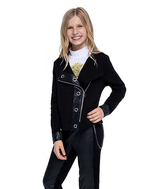 Жакет для девочки свободного силуэта в стиле косухи дополнен застежкой на молнии и двумя внутренними карманами. Вставки из кожзама на манжетах и в районе застежки украшают изделие. Ткань футер гарантирует износостойкость и комфорт в носке.
