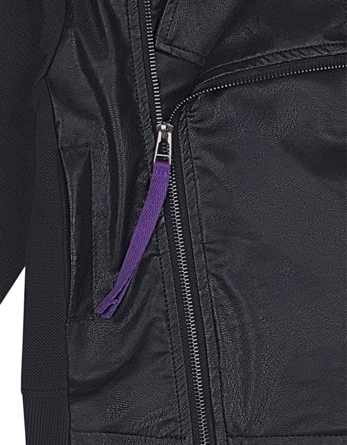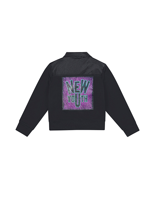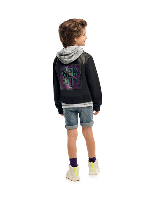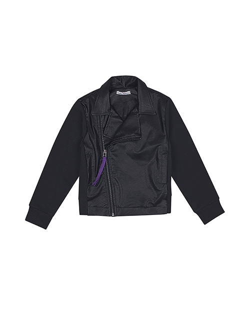 Черный жакет для мальчика с элементами косухи. Функциональные карманы в боковых швах и асимметричная застежка по переду. Застежка на молнии. Манжеты рукавов и низ спинки из рибаны. Оформление в стилистике капсулы "Дружище Бакс".