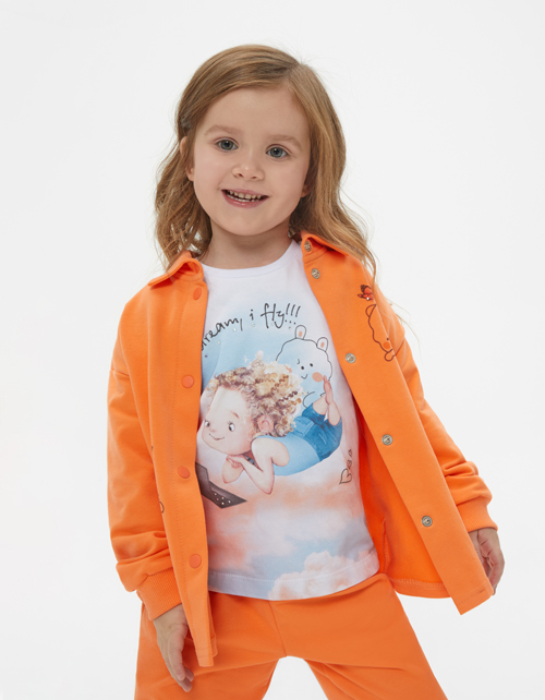 Жакет-рубашка сочного оттенка райский мандарин для девочки. Стильное изделие из футера с длинным рукавом. Модель декорирована стразами и цифровой печатью с двух сторон.